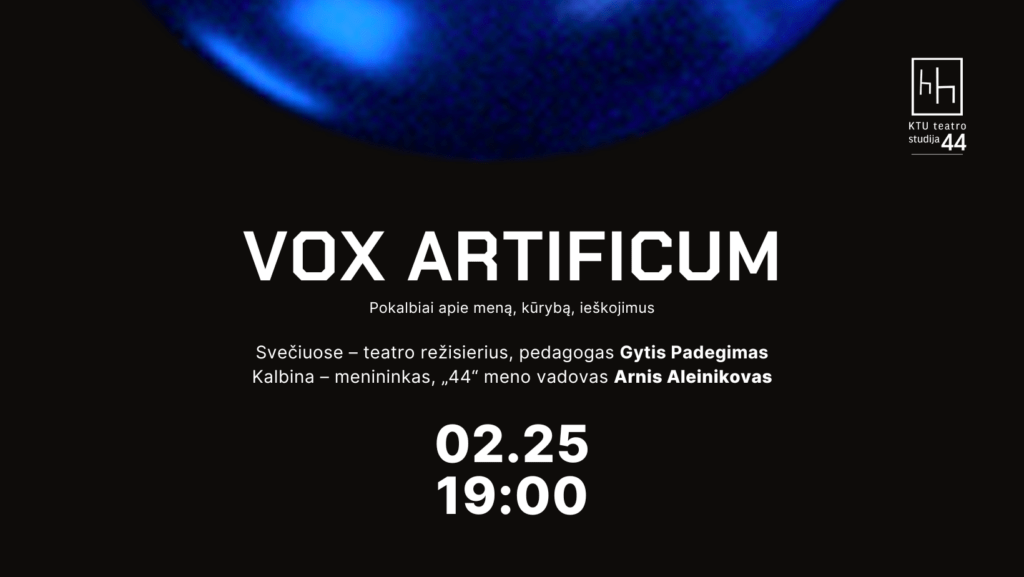 KTU teatro studija „44“ kviečia į pokalbių ciklą „VOX ARTIFICUM“ (iš lotynų kalbos „Meninink(i)ų balsas“), kuris skirtas nematomų kūrybinių procesų, meninink(i)ų kasdienybės, ieškojimų, atradimų ir dabartinių tendencijų apžvalgai.